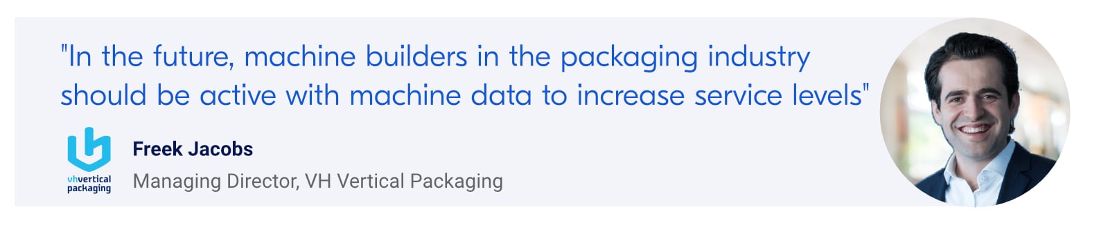 VH Vertical Packaging ist der Meinung, dass es wichtig ist, sowohl für den Kunden als auch für sich selbst Erfolge durch Service zu erzielen. Sie wollen dem Kunden eine Plattform bieten, die ihn entlastet und es ihm ermöglicht, Service auf der Grundlage von Daten zu leisten. 'Wenn der Kunde den Mehrwert sieht, weil seine Produktionslinie besser läuft, ist er auch bereit, dafür zu bezahlen', sagt Freek Jacobs, Geschäftsführer bei VH Vertical Packaging.