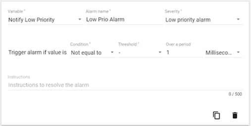 To create and receive alarms from your Universal robot add a new node in the IXON Connector you also need Machine Insights Cloud. Choose the variable, the priority, set the condition and instructions for the operator. Next, define who must receive a mobile push message or email when the alarm is triggered.